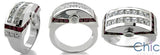 Art deco style anniversary ring, topped with AAA high quality princess cut stones in two rows in channel setting. Accented with ruby color princess cut stones all around the ring. Front and back view of the ring has a round stone in bezel setting. Heavy shank.