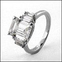 An alluring engagement ring with high polished solid shank, a high quality emerald cut cubic zirconia center stone with baguettes in prong setting on the sides.