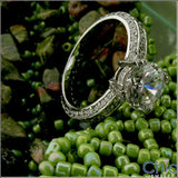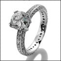 Elegant engagement ring set with AAA quality 1.5 Ct . round stone in prong setting. Prongs have jeweled small pave set stones. The band has 3 rows of pave set stones all the way around the band.