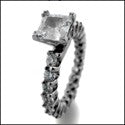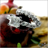 Fancy engagement ring set with high quality AAA 1 carat princess cut in "V' Prong setting.Eternity style set round stones in prongs on the bands.