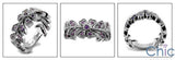 A striking eternity band with a flower designed shank and round high quality lavender cubic zirconia in pave setting.