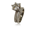 This 2.5 Carat AAA High Quality IGI certified Cubic Zirconia Engagement Ring is for people that love tall/high profile settings. The 2.5 carat CZ is set in 6 prongs setting. The prongs are jeweled with micro pave small round cz stones. The dome shank is 3.0 mm wide and has 3 rows of micro pave set stones The engagement rings sides stones go half way down the shank. The shank is made in comfort fit. The overall height from the base of the prong to the tips of the prongs is 10.25 mm