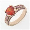 An eye-catching engagement ring with a high polished solid shank and a high quality round orange cubic zirconia center stone in prong setting along with round pink cubic zirconias in pave setting on the sides.