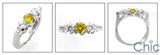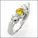 Exquisite ring for any occasion with high polished solid shank with side design contours and one canary center and four white high quality cubic zirconia of which three round shaped in half bezel setting and two baguettes in channel setting.