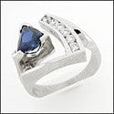 A unique high polished shank design with a high quality triangle sapphire colored cubic zirconia in V prong setting and round cut cubic zirconias in a channel setting on the side.