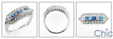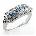 Antique style estate ring with high polished finish and three high quality burnished sapphire color and white cubic zirconias as well as round cubic zirconias set in prong/pave settings on the sides.