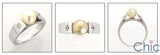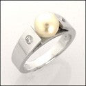 A special ring with a solid high polished shank and a unique synthetic pearl center with two round shaped high quality cubic zirconias burnished on the sides.