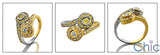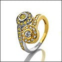 A lovely two tone anniversary ring with a high polished solid shank, two round center stones in bezel. The ring has a canary and clear color cubic zirconia set in pave totaling 0.60 carat.