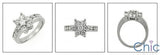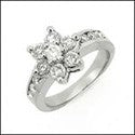 A flower design ring with a high polished solid shank and high quality round cubic zirconias in prong and channel setting.