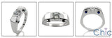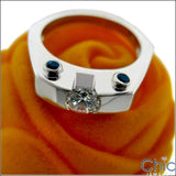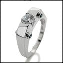 A modern chic design ring with high polished solid shank and round AAA high quality center in channel setting and four blue sapphire color round cubic zirconias set in bezel on the sides.