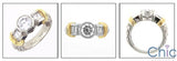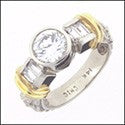 A two tone engraved solid shank ring with high quality round cubic zirconias in the center in bezel setting and high quality baguette cubic zirconias in channel setting.