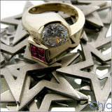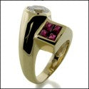 Elegant right hand modern ring. AAA high quality round center in bezel setting, and ruby colored princess cuts in invisible setting. Heavy shank.