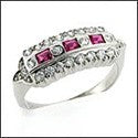 Antique style estate ring with high polished finish and three high quality burnished ruby color and white cubic zirconias as well as round cubic zirconias set in prong/pave settings on the sides.