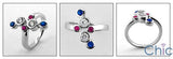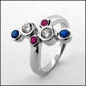 A unique ring with a high polished solid shank with beautiful sapphire and ruby colored cubic zirconias, and two clear cubic zirconias, all in bezel settings.