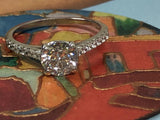 Classy engagement ring with 1.0 carat AAA high quality,lGI certified round Cubic Zirconia center stone. The center stone is set in low profile 4 prong basket. The sides are set with pave set small round cz stones, 7 stones on each side of the ring. The width of the shank is 1.7 wide.
