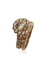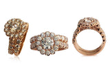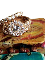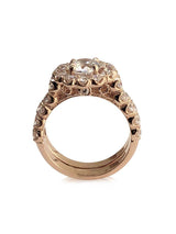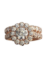 Rose gold cubic zirconia engagement ring with matching wedding band. This eye catching cz engagement ring is showcasing a 1.0 carat AAA highest quality, IGI certified round brilliant center stone. The round cubic zirconia is set in prongs in a halo setting. The halo is topped with larger than usual round cz stones in share prong setting. The under gallery has delicate swirls. It's also showcasing a small bezel set round stones from both sides. The cz engagement ring and perfectly matched wedding band are made in 14k solid rose gold. "14K" stamp is inscribed. Rose gold is also known as Pink gold.
