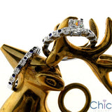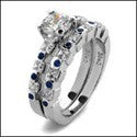 A beautiful eye-catching matching band with high polished shank, with high quality round cubic zirconia center stone set in prong, with princess cut cubic zirconias set in channel on the sides, with sapphires blue round cubic zircoinas set in channel on the sides.