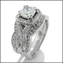 Eye catching engagement ring set, topped with 1.25 AAA high quality cushion cut in double wire prongs, surrounded by small pave set round stones. Gallery underneath, the engagement ring is accompanied by two pave set matching bands, so it can create a nice proportion and balance.