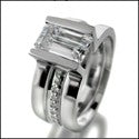 Unusual, simple, yet elegant matching ring set, with elongated 1.25-carat emerald cut in channel suspended setting. Middle row covered by pave set round stones.