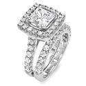 Very popular 1.5 carat princess cut cubic zirconia engagement ring with a matching cz wedding band. This eye catching cz engagement ring set is showcasing a 1.5 carat AAA high quality, IGI certified Princess cut center stone. The princess cut cubic zirconia is set in double wire prongs in a halo setting. The halo is topped with small round cz stones in share prong setting. Each small round pave set stone is around 0.05 carat. The shanks of the wedding band and the engagement ring are set with round cubic zirocnia as well. The cz engagement ring set is made in 14k solid white gold. "14K" stamp is inscribed. The 14k white gold has a Rhodium coating as well.