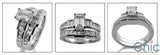 Cute engagement ring set. Center stone is an AAA high quality Emerald step cut set in prongs, sides have channel set baguettes and princess cuts. Matching contoured band.