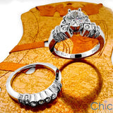 A appealing matching band with high polished shank, with high quality round cut cubic zirconia center stone, with high quality cubic zirconias on the sides set in pave and bezel, and high quality cubic zirconias on the band set in pave and bezel setting.