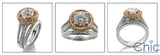 Classy matching engagement ring set with antique style in two tone metal, topped with AAA high quality round center stone in prong setting in ROSE gold, covered with tiny round stones in pave setting. Split shank and the matching band are set with micro paved round stones.