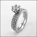 A striking matching band with high polished solid shank, a high quality round cubic zirconia center stone, with small round cut cubic zirconias set in pave.