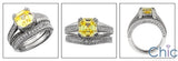 A stunning matching band with high polished shank and a high quality asscher cut canary cubic zirconia in prong setting with round diamond cubic zirconias in pave setting on the sides.