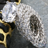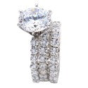 Eye catching engagement ring set with high quality AAA cubic zirconia in 6 prong's Tiffany setting.The shank has eternity style set round stones in prong setting. The engagement ring has two matching bands that can be worn on on each side or the way it is piCt ured