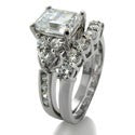 A stunning ring set, with a beautiful high quality AAA two carat emerald cut center in a prong setting with round stones on the sides. Curved band has prong set round stones.