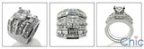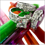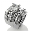 2 CARAT HIGH QUALITY PRINCESS CUT CUBIC ZIRCONIA ENGAGEMENT RING WITH DOUBLE MATCHING BANDS. This striking cz engagement ring set has a high polished solid heavy and wide shank, and AAA high quality, IGI certified Princess cut diamond quality cubic zirconia center stone. The Princess cut cubic zirconia is set in V shaped style 4 prong setting. The shank of the set has princess and baguette shaped diamond cubic zirconia in channel setting on the sides. PerfeCt ly fitted 2 matching wedding bands completes the set.The cubic zirconia matching engagement ring set is made in solid 14k white gold. "14K" stamp is inscribed.