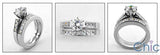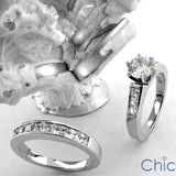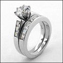 A delicate matching band with high polished solid shank, a high quality round cubic zirconia center stone, and princess cut cubic zirconias on the sides.