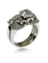 You don't have to spend a fortune...This stunning engagement ring with a matching band is showcasing a 2 carat AAA high quality, IGI certified Round Cubic Zirconia Center stone in 4 prong setting. The immediate side stones are 0.32 carat each round cz's. The shoulders are accented by small round stones in pave setting and front and back view of the ring has two bezel set stones as well.The diamond shaped contour adds t magnificence to this design. The wedding band has 5 stones in shared prong setting and each stone is a hald a carat.