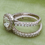 Absolutely gorgeous round cz brilliant cut cubic zirconia engagement ring with a matching band. This classy cz engagement ring is showcasing a 1.5 carat AAA high quality, IGI certified Round center stone set in prongs. The round cz center stone cubic zirconia is set in a halo encircled setting. The halo is jeweled with small round cz stones in pave setting. The engagement ring's and cz matching wedding band's shanks have pave set round stones as well.The cubic zirconia engagement ring set is made in 14k solid white gold. "14K" stamp is inscribed. The 14k white gold has a Rhodium coating as well.