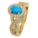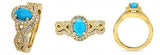 This Turquoise elegant ring with fitted band are made in 14k solid Yellow Gold. The center oval shaped Turquoise is surrounded by small pave set halo.
