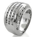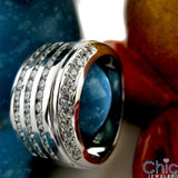 A striking wedding anniversary band with high polished shank. 12.5mm wide. The band is topped with 3 rows of channel set AAA high quality round stones and pave set stones on the front and back view of the ring. Heavy solid shank.