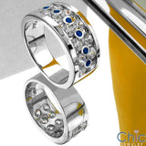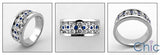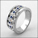 A striking wedding band with high polished shank, with high quality round clear cubic zirconias in channel setting, and blue sapphire cubic zirconias in bezel setting.