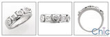 Unique high polished thick shank wedding band with square and round details on mounting with five high quality cubic zirconias in bezel setting.