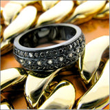 Very trendy black Rhodium coated solid 14k gold wedding band. The band has 6mm width. The top part of the band is hand set with black high qaulity cz stones and diamond cz stones in the middle row. The black texture of Rhodium gives an antique yet chic touch to the overall style of the wedding band. The "14k" stamp is inscribed. It s perfeCt wedding band with cz for somone that like to stand out and be unique.