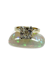 This 2 Carat Round Brilliant Cubic Zirconia AAA highest Quality, IGI certified stone is set in two tone gold setting. The shank is 2.5 mm in width. The shank tapers down as it reach the prongs. The double wire prongs are in white gold setting. The tips of the prongs are formed into a heart shape. The overall profile of this solitaire ring is high. The height of the prongs reach 11 mm.