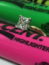 A simple yet elegant solitaire ring with a high polished solid gold shank and a princess shaped diamond cubic zirconia in a high polished white gold V prong setting.