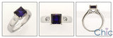 Tiffany style ring, with high polished solid shank and princess cut blue sapphire color center in prong setting and two round shaped white high quality cubic zirconia burnished on the sides.