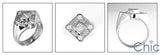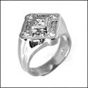 A unique mens ring design with a very heavy high polished contoured solid shank and a square design top with princess and round high quality cubic zirconia in burnished and channel setting.