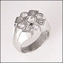 A unique mens ring design with a very heavy high polished contoured solid shank and a cross design top with round and baguette high quality cubic zirconia in burnished, channel and bezel setting.