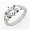 A attraCt ive three stone ring with high polished solid shank and a high quality round dimaond cubic zirconia center stone in prong setting and round diamond cubic zirconias in prong setting on the sides.