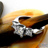A striking three stone ring with high polished solid shank, a high quality princess cut cubic zirconia center stone in prong setting with princess cut cubic zirconias in prong setting on the sides.