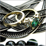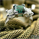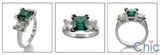 A attractive three stone ring with a high polished solid shank and AAA high quality princess cut emerald color cubic zirconias center stone in V-prong setting along with princess cut diamond cubic zirconias in V-prong setting on the sides.
