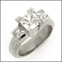 A modern, solid polished shank ring with a high quality princess cut cubic zirconia in a V prong setting and two princess cut cubic zirconias in channel setting along the sides.