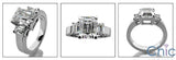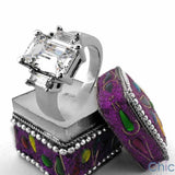 A dazzling three stone ring with high polished solid shank and high quality Emerald cut cubic zirconia center stone in prong setting and baguette cubic zirconias on the sides in prong setting.